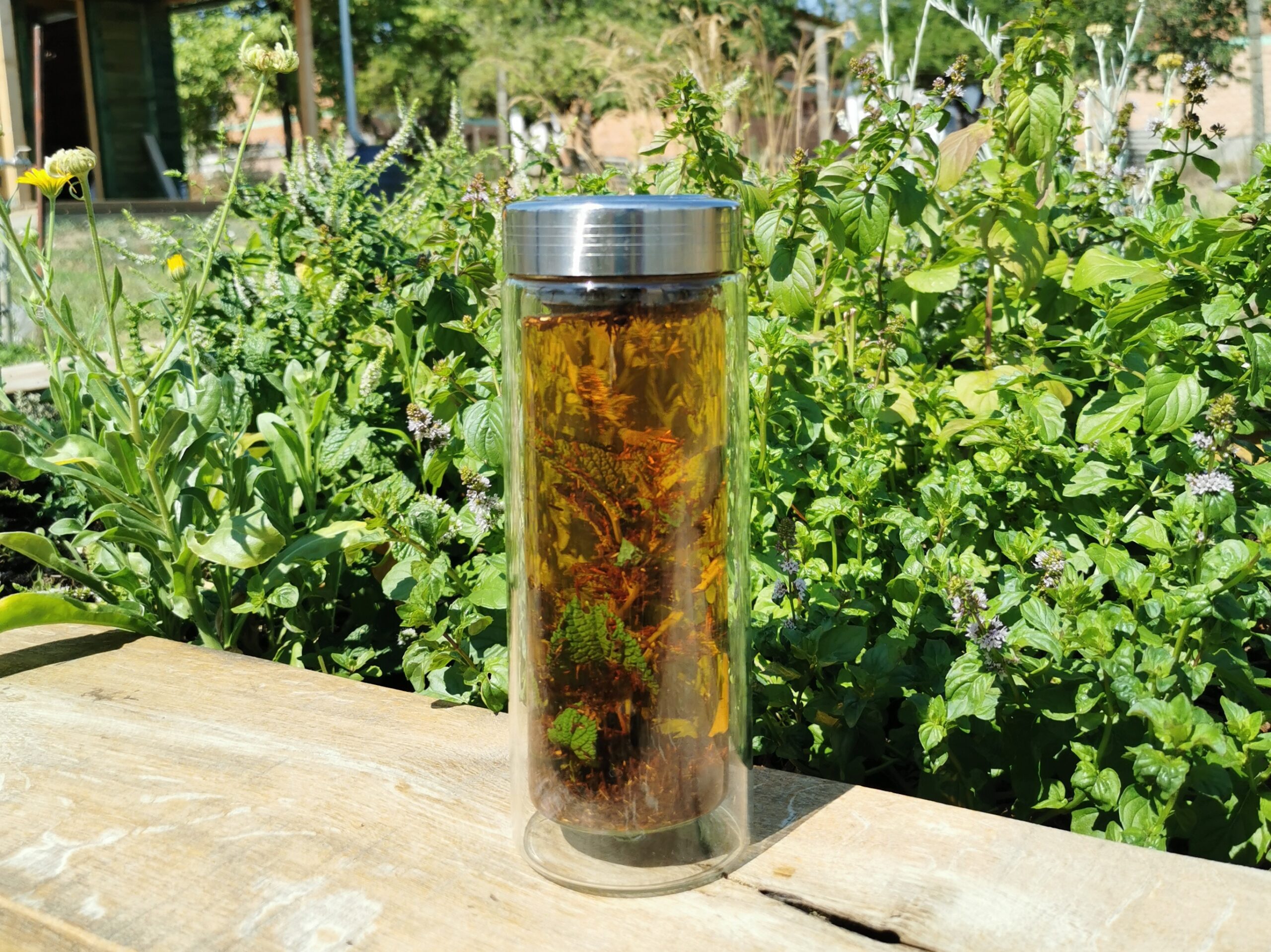 – fogj egy üveg limonádés kancsót, tégy az aljára 2 csapott evőkanál szálas rooibos teát,